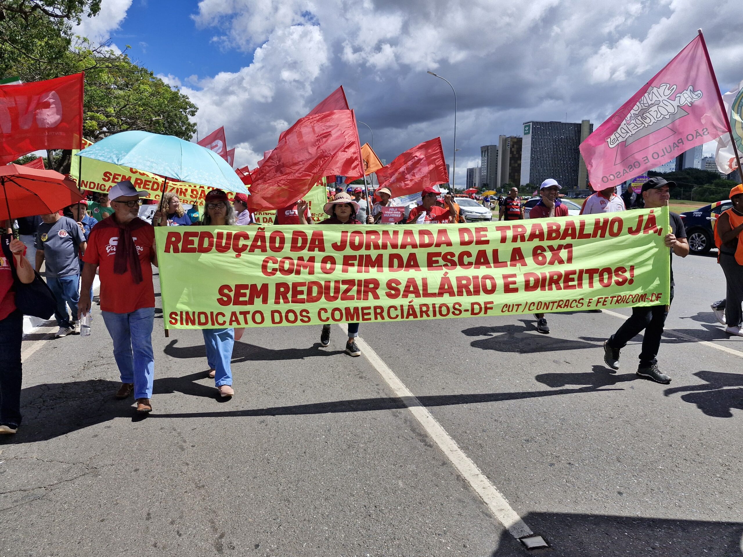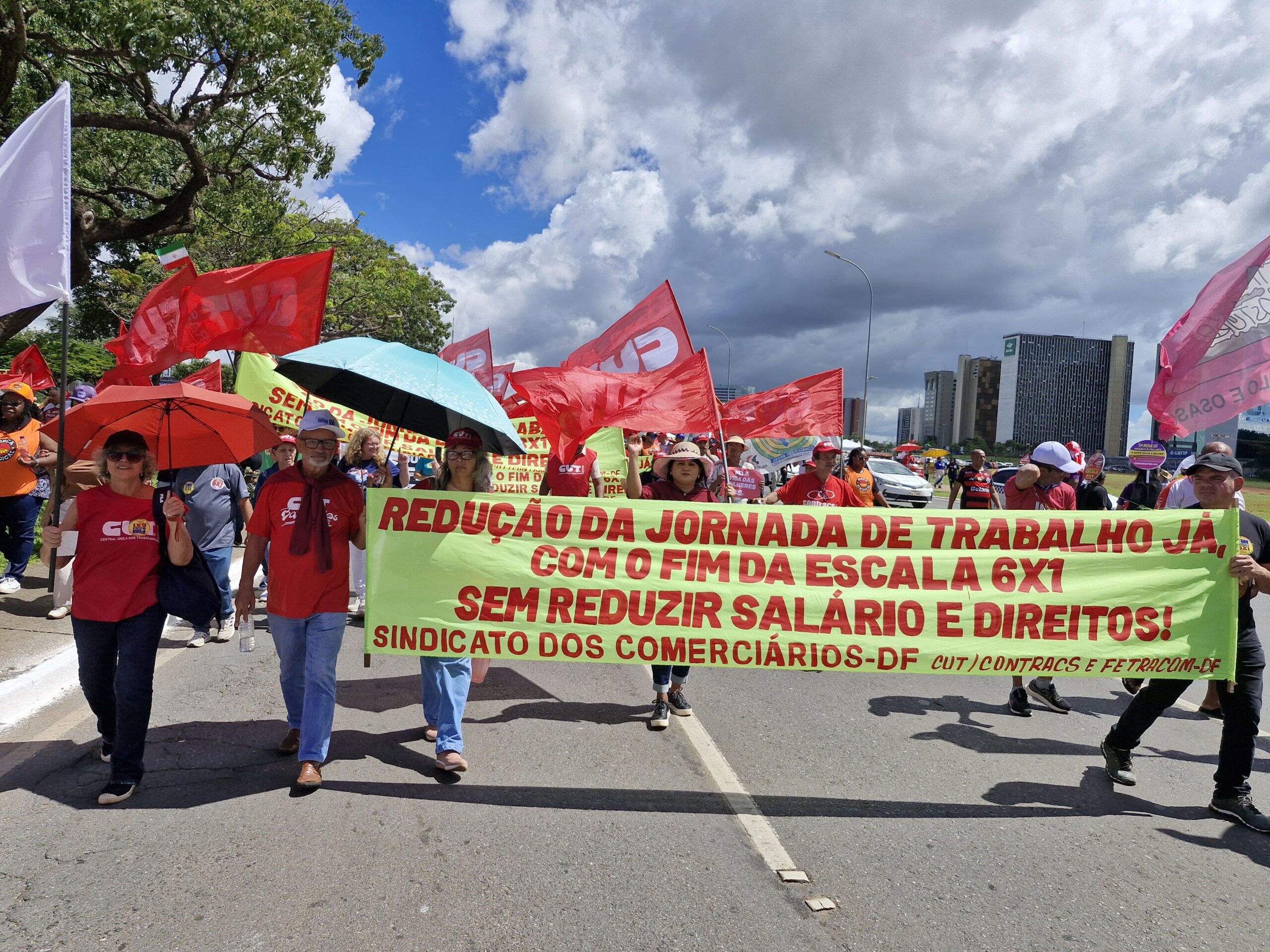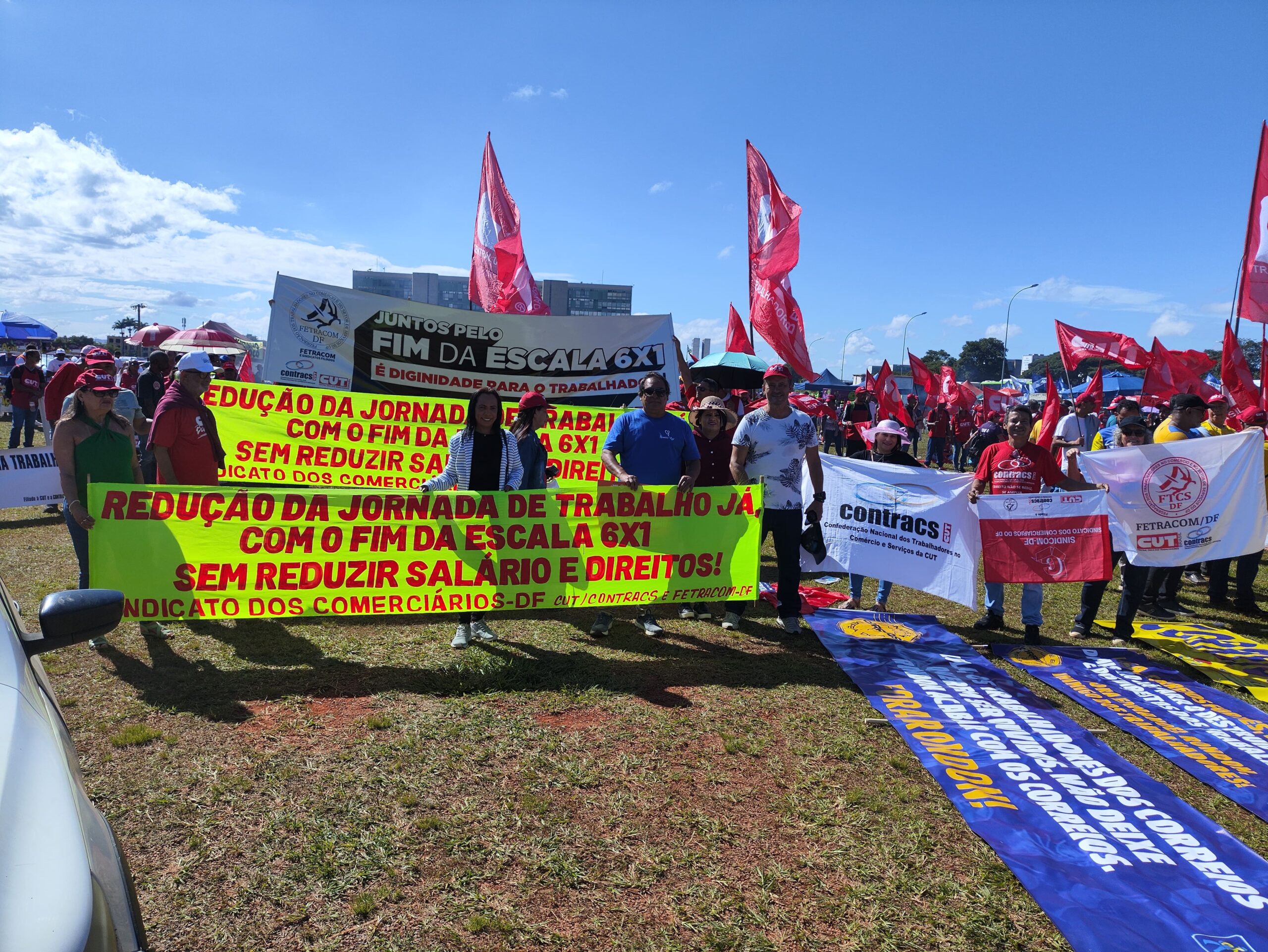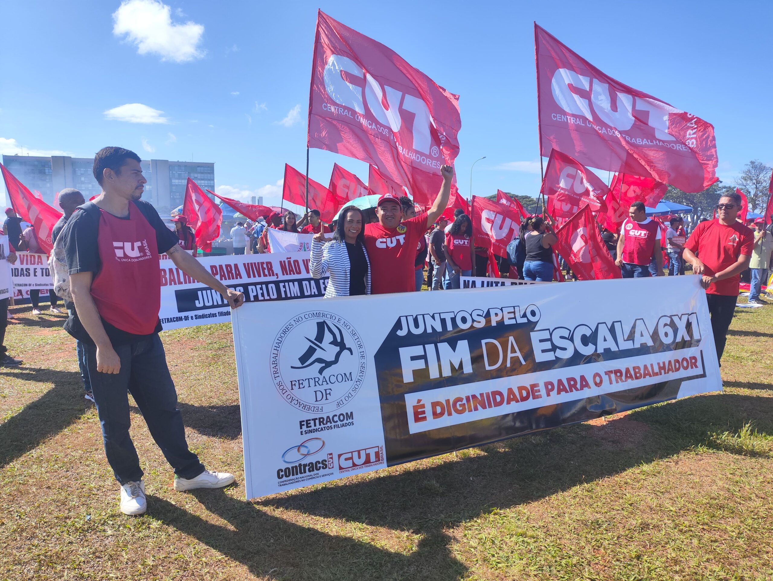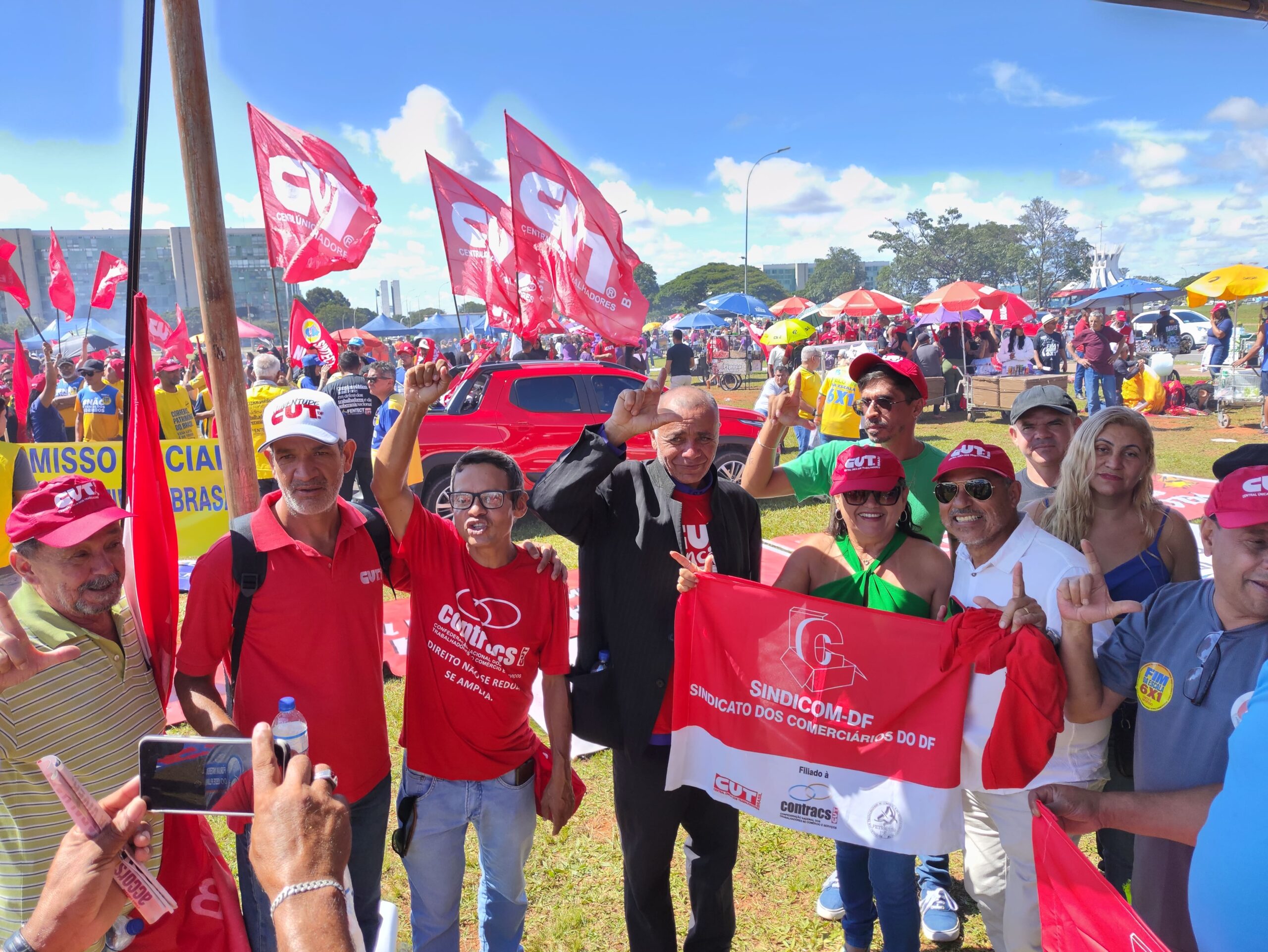 Com bandeiras, faixas e muita disposição, trabalhadoras e trabalhadores do comércio e serviços do DF se somaram a milhares de manifestantes, dando visibilidade à luta pelo fim da escala 6×1, por melhores condições de trabalho e pela valorização profissional.